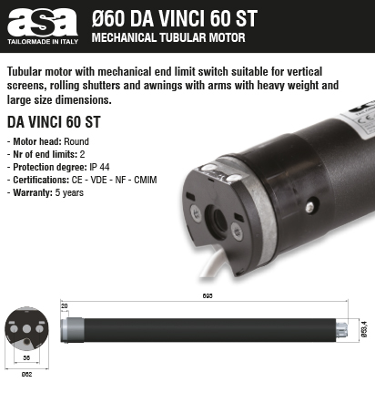 CODE DESCRIPTION TORQUE SPEED POWER SUPPLY LS ROUNDS CONSUMPTION LENGHT MOTOR WEIGHT 2252150 DAVINCI 60 ST 80/12 G1 A1 B1 80 Nm 12 rpm 230 V ~/50 Hz 23 290 W 695 mm 4,45 Kg 2253142 DAVINCI 60 ST 100/12 G1 A1 B1 100 Nm 12 rpm 230 V ~/50 Hz 23 350 W 695 mm 4,55 Kg 2254138 DAVINCI 60 ST 120/12 G1 A1 B1 120 Nm 12 rpm 230 V ~/50 Hz 23 400 W 695 mm 4,70 Kg - Brackets - round head